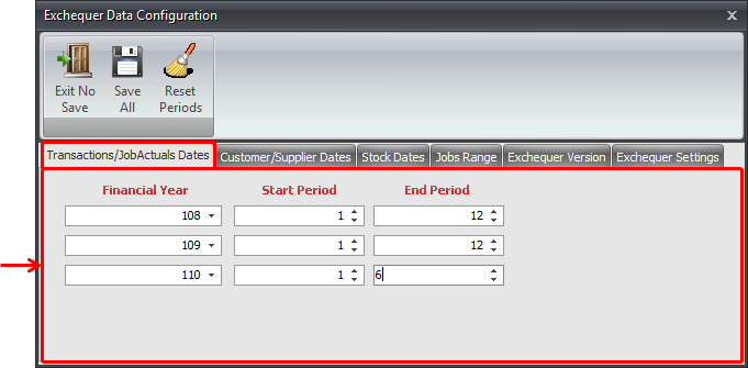 In the Exchequer Data Configuration window you will see a number of tabs: