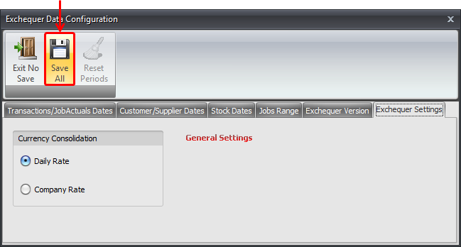 In the Exchequer Data Configuration window you will see a number of tabs: